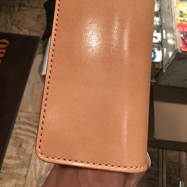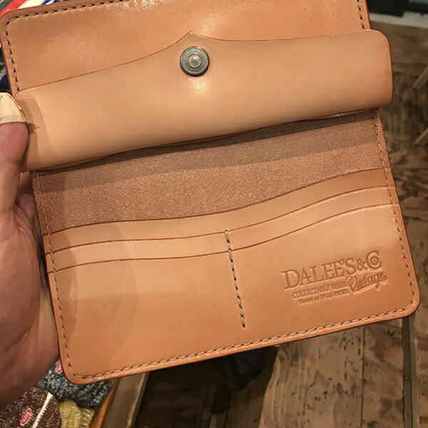 DALEE'S&CO Lot:RESULT 大半のレザーウォレットは、ステッチングルーバーという工具にて表面の糸道を削り取るのだが、ダリーズ&COでは削りを入れずに自作工具を使用し、糸の太さ分の革を圧縮し溝に糸を埋め込む。